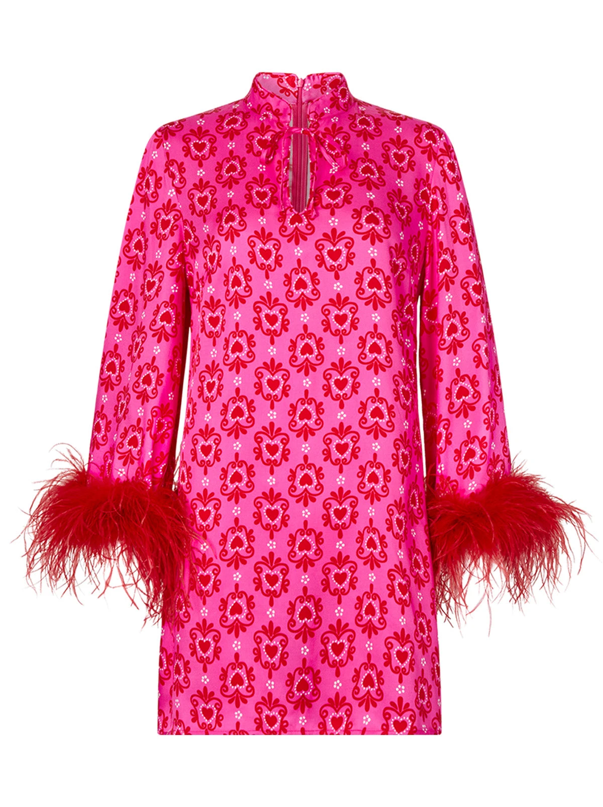 The ultimate retro mini party dress. Pairs well with a 1960s sports car. Carlotta is a pink and red retro heart print mini dress on viscose satin. She’s the main character. Features a Cheongsam-inspired collar with ties and a relaxed fit.Â