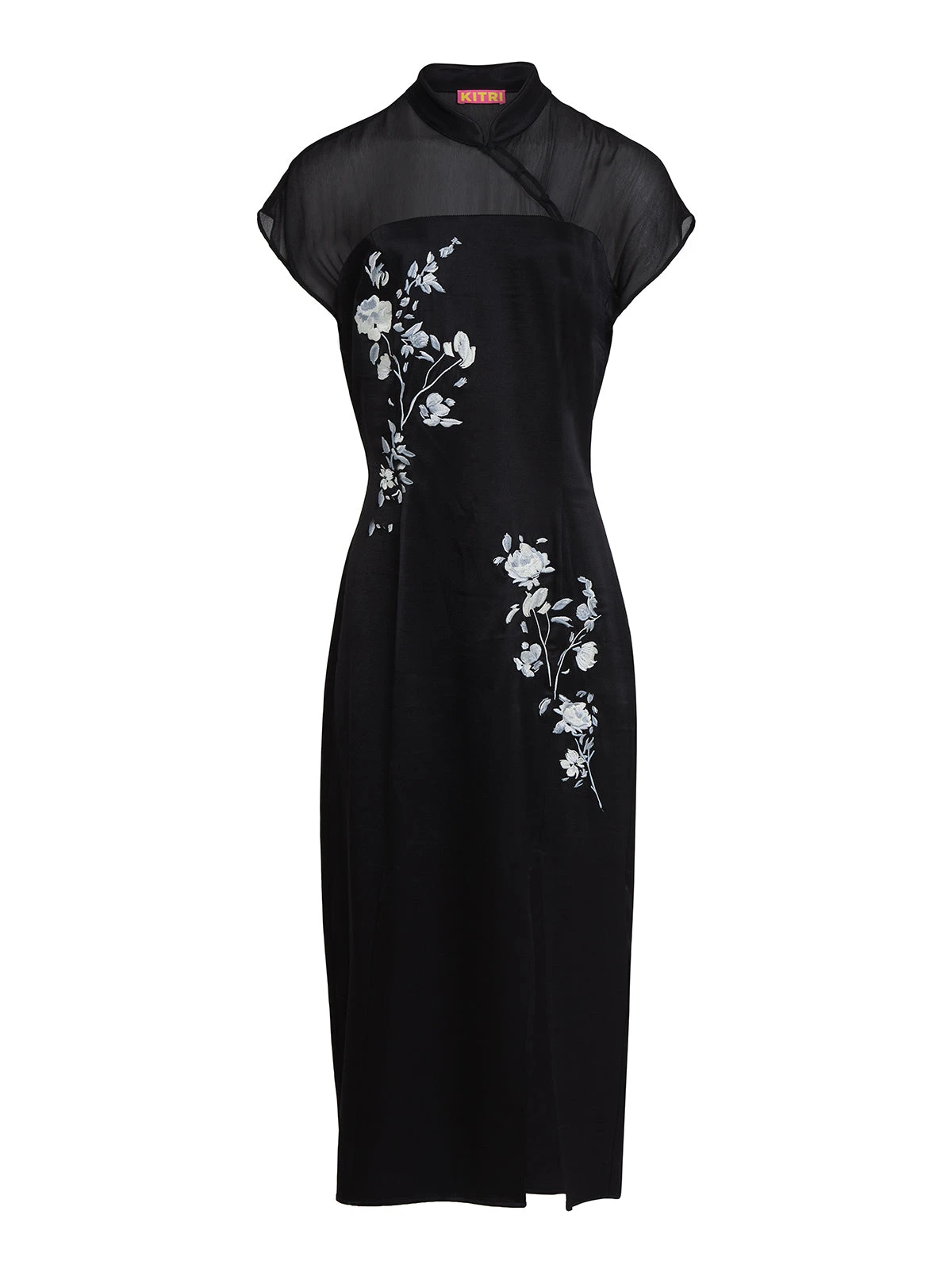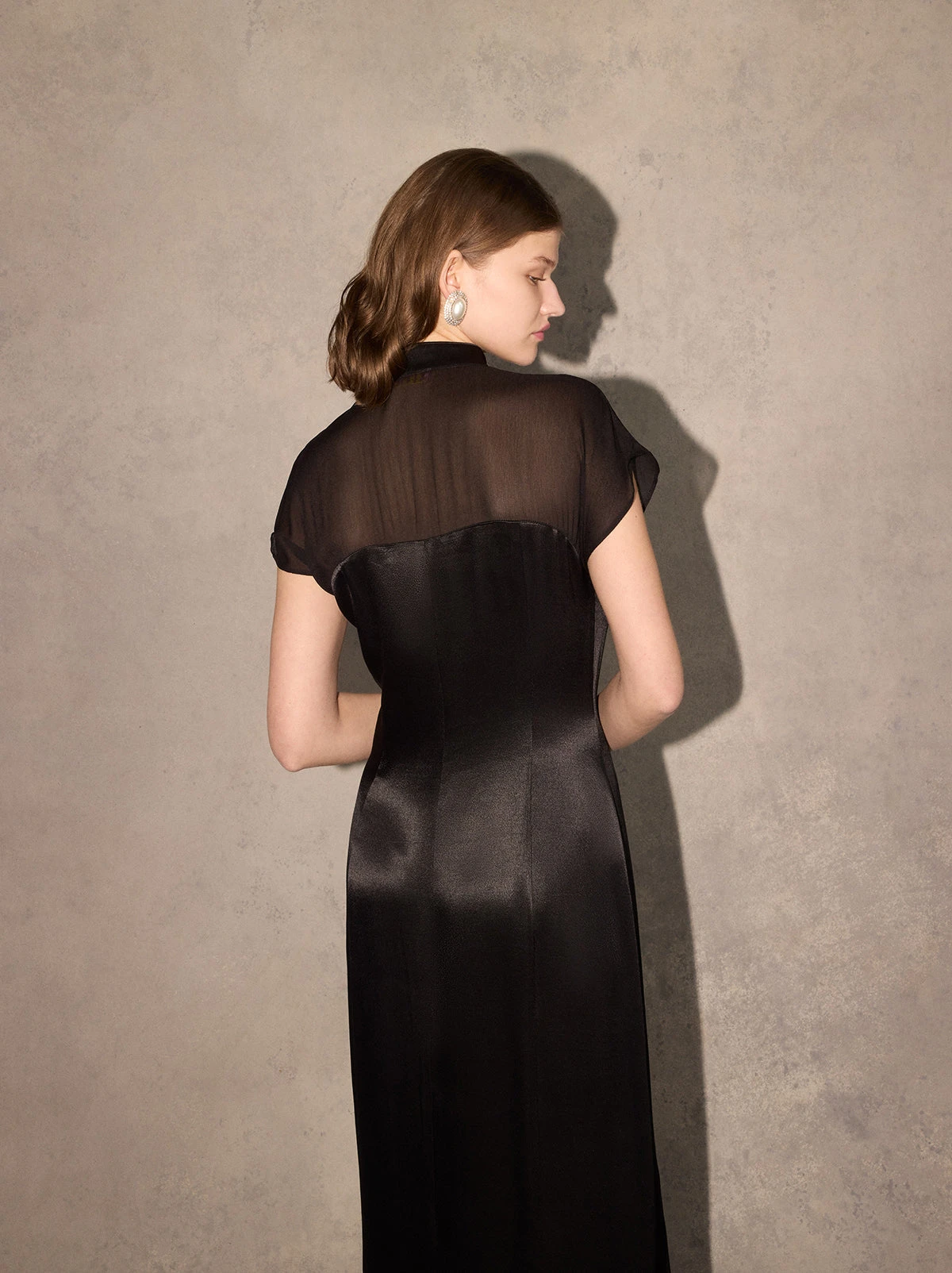Sheer joy. Clio is not just any little black dress; she’s a statement piece, blending the iconic staple of the ’90s with a modern twist. Crafted from silky, textured heavy satin, Clio features a sheer georgette yoke that adds a touch of ethereal romance. The asymmetric satin summarys and tonal floral embroidery bring a delicate contrast, while the high-split skirt ensures this dress is anything but ordinary. Whether you’re attending a sophisticated dinner or a stylish soirée, Clio promises to be the perfect companion.