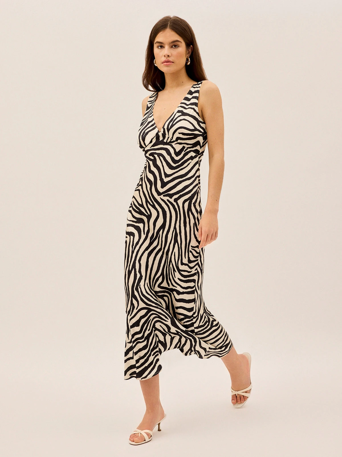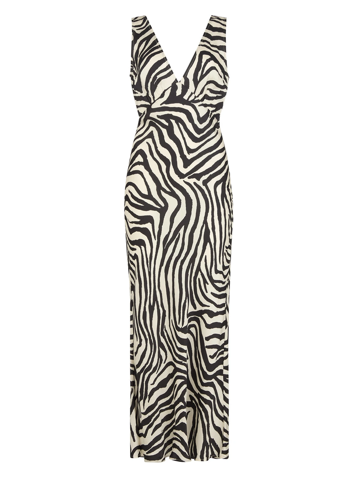 Sleek, sophisticated, and effortlessly cool & the Danna Dress is your new go-to for making a statement with ease. Cut on the bias for a figure-skimming fit, this maxi dress drapes beautifully, moving with you from day to night. The sleeveless silhouette and V-neckline keep things chic and timeless, while the bold zebra print adds a modern edge.