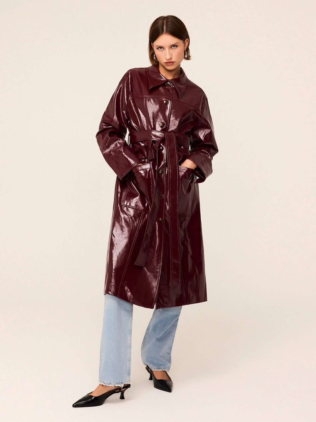 Compliments guaranteed. Dominique is a retro-inspired vinyl car coat designed to add a dash of sophistication to your autumn wardrobe. Its deep burgundy hue is a refreshing take on traditional outerwear colours, making it ideal for anyone seeking a bold yet elegant statement. The exaggerated collars and patch pockets infuse the coat with retro appeal, while the belt offers the option of a cinched waist or a more relaxed fit. Dominique effortlessly elevates even the simplest of outfits, making it a must-have for the season.