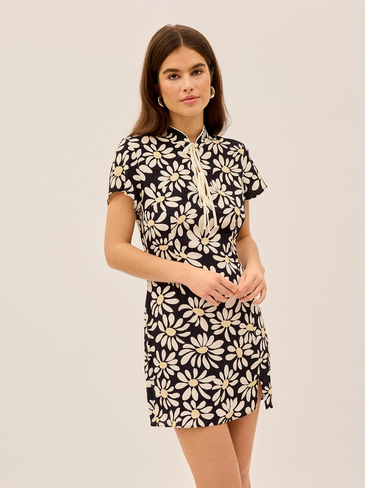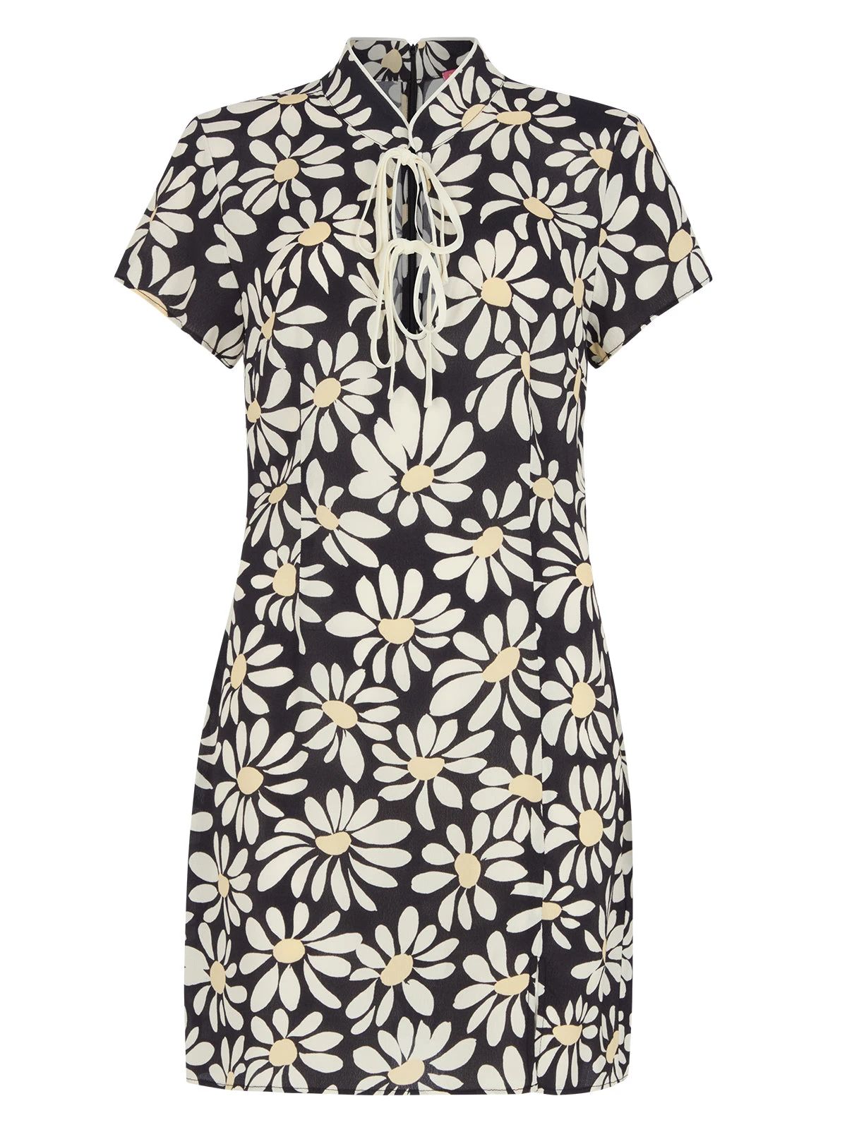 A KITRI Girl all-time favourite, back in a fresh daisy print. The Gretchen Dress is a cheongsam-inspired mini dress, designed with a tie detail at the neckline, short sleeves, and a subtle leg split for just the right amount of flirtiness.