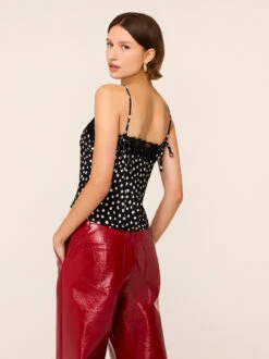 Romantic and effortless, the Ione top is new silhouette in soft, fluid viscose satin. Designed in timeless polka dot in butter soft yellow hue, it features a deep V-neckline with delicate frill trim, a tie-front fastening, and long sleeves finished with softly gathered cuffs. An easy statement piece that adds a touch of femininity to everyday looks.