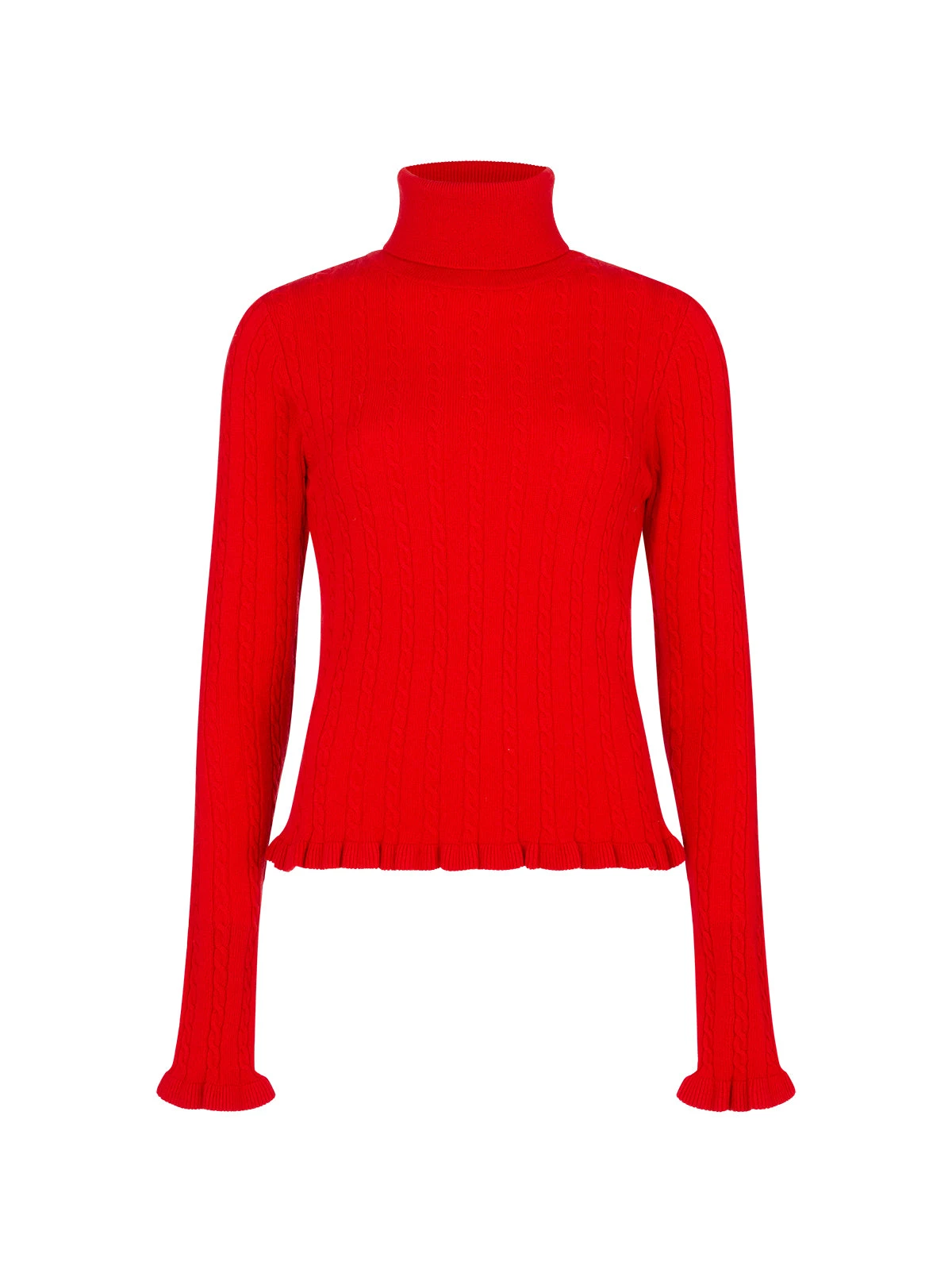 This lightweight wool-blend roll-neck jumper in a striking red is the ultimate layering hero for the cooler months. Designed with a subtle cable knit, cosy roll neck, and delicate frill detailing at the cuffs and hem, it strikes the perfect balance between feminine charm and everyday ease. Slip it under tailoring, style with your favourite denim, or layer over dresses to add a vibrant pop of colour to any outfit.