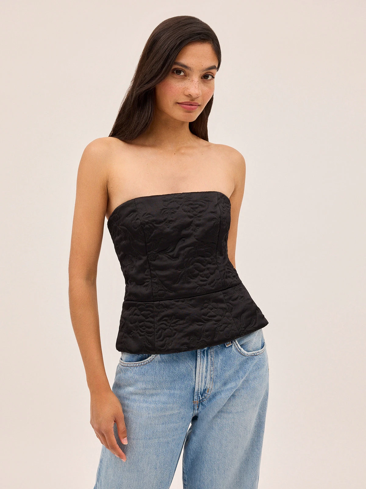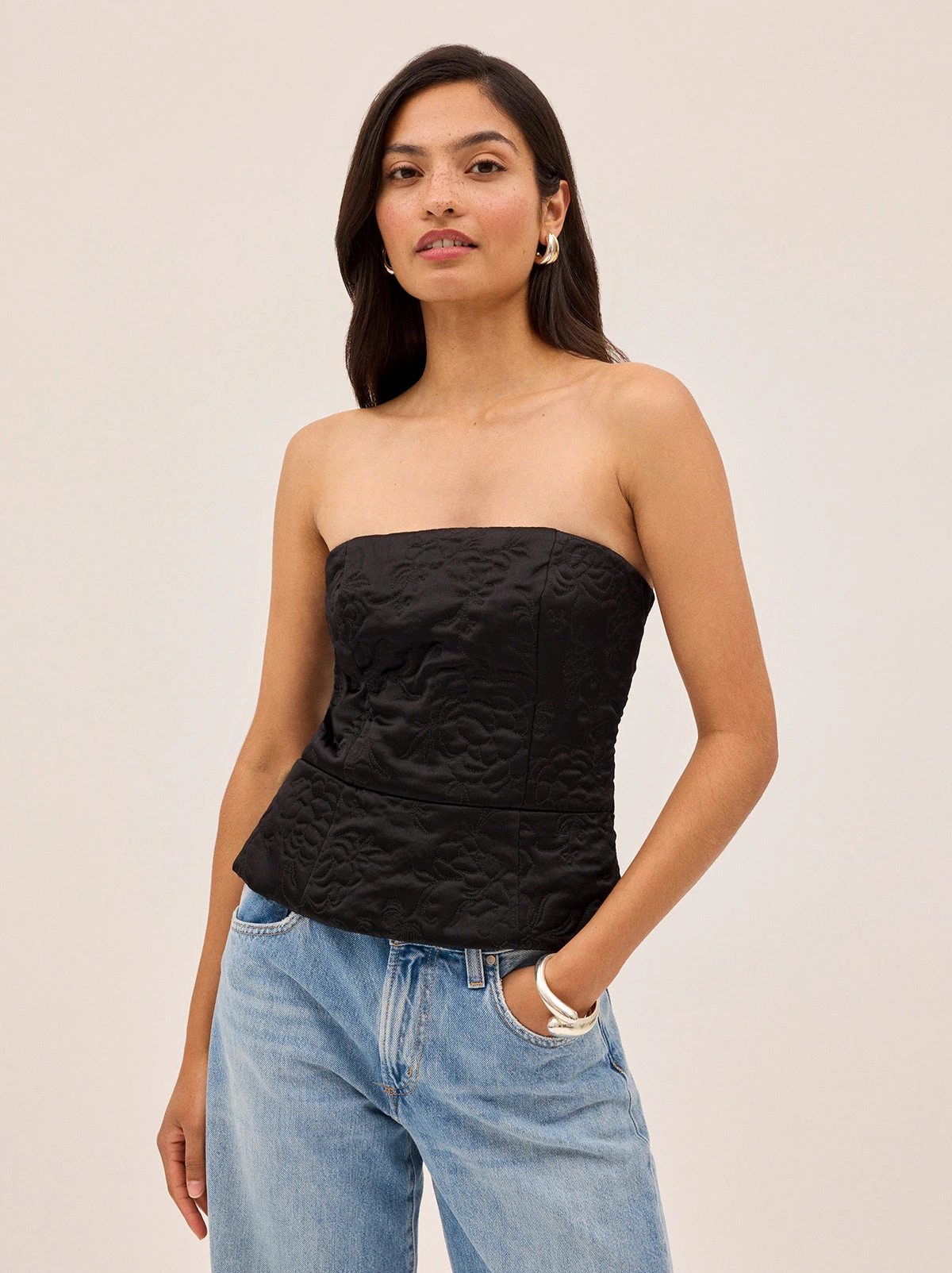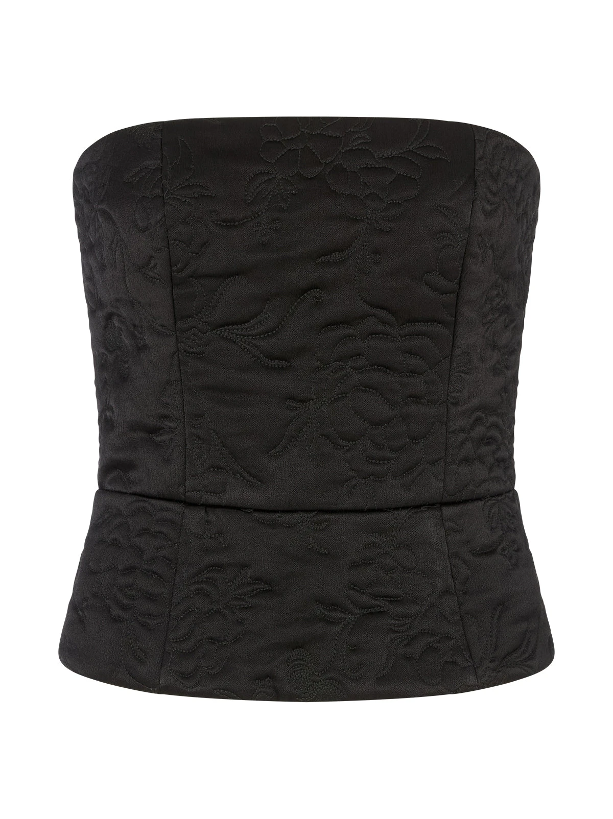 Perfect for Autumn/Winter, corset-inspired Petra Bandeau top is crafted from lustrous black viscose satin and lightly quilted with a floral motif inspired by traditional Korean paintings. A peplum hem adds subtle structure, while a centre-back zip and shirred panel ensure a comfortable, flexible fit. Style with tailored trousers, denim, or the matching Hani Quilted Jacket for a polished look that transitions effortlessly from day to night.