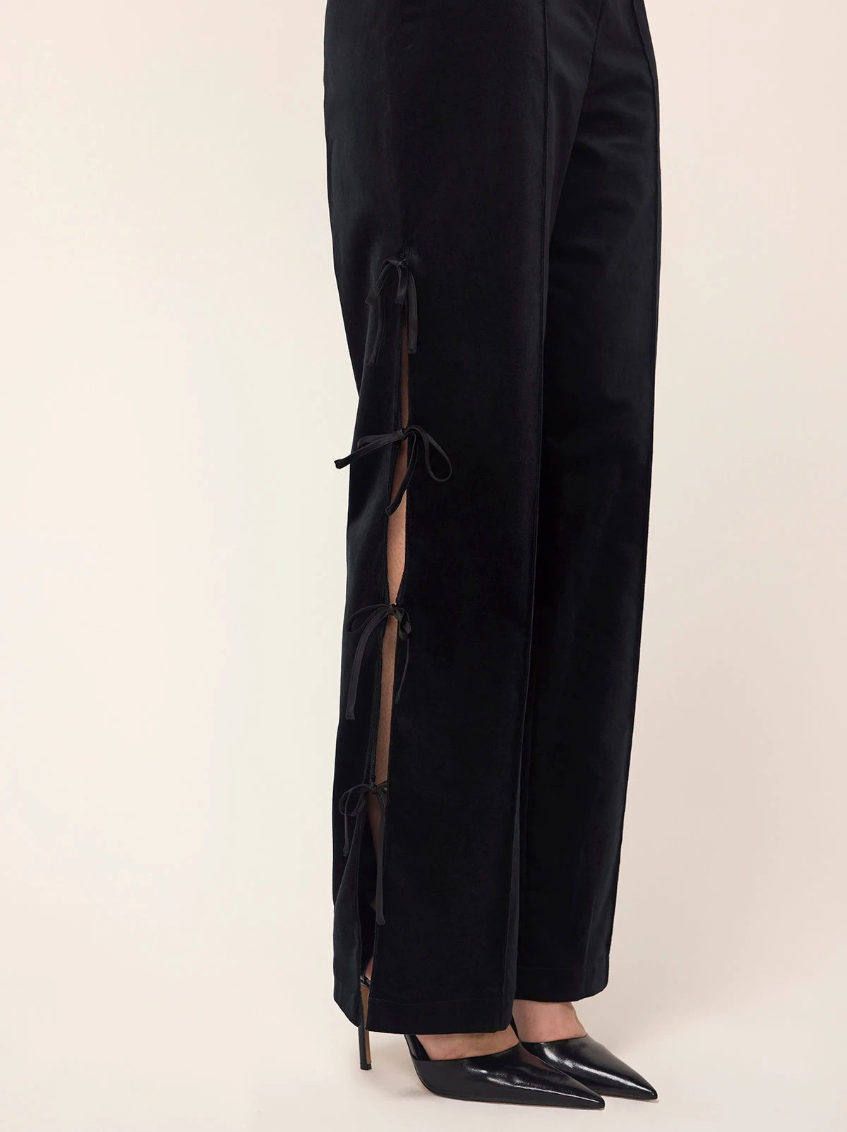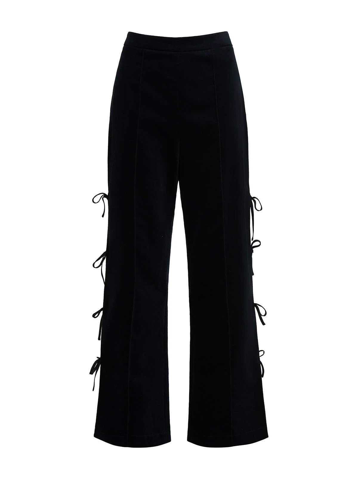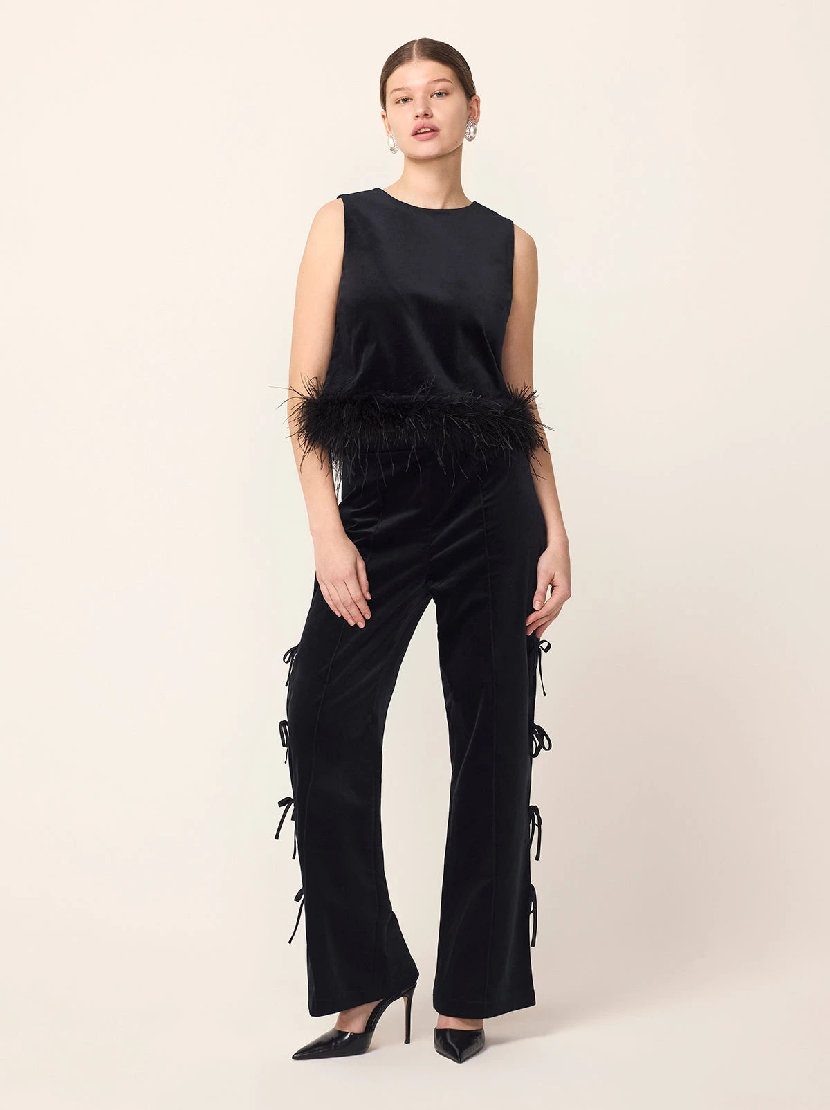 She’s a showstopper. Introducing Rosamund, a straight-leg pin-tuck trouser with functional satin ties along to outer edge of each leg, showing a scintilla of skin between each (should you please). Crafted from our new cotton-blend velvet, she is structured whilst still feeling soft to the touch. For the ultimate centre-stage moment, pair with co-ordinating Marlene Black Velvet Feather Blazer and Lou Lou Black Velvet Feather Top.
