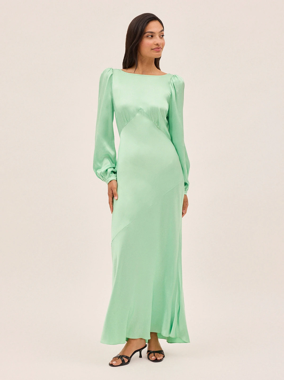 Slip into timeless elegance with this flowing Yara Mint Satin Maxi Dress, designed to turn heads from every angle. Cut on the bias for a beautifully fluid drape, the skirt features subtle panel detailing and a flattering waist seam that defines your silhouette. A wide, graceful neckline and voluminous long sleeves add vintage-inspired glamour, while the deep V-back delivers an unexpected touch of drama. The fresh mint hue makes it a standout choice for both daytime events and evening occasions.